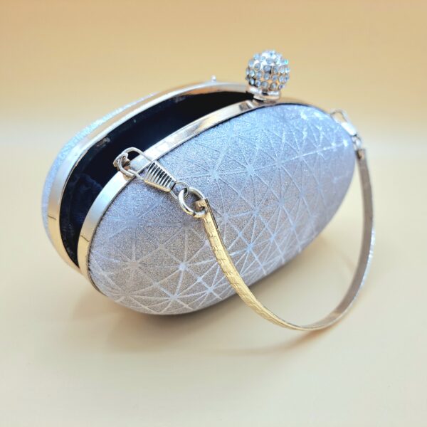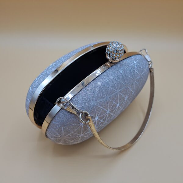 Elevate your evening look with this chic oval clutch. Features a shimmering silver-grey fabric with a subtle geometric pattern and a dazzling rhinestone-encrusted clasp. Perfect for weddings, parties, and formal