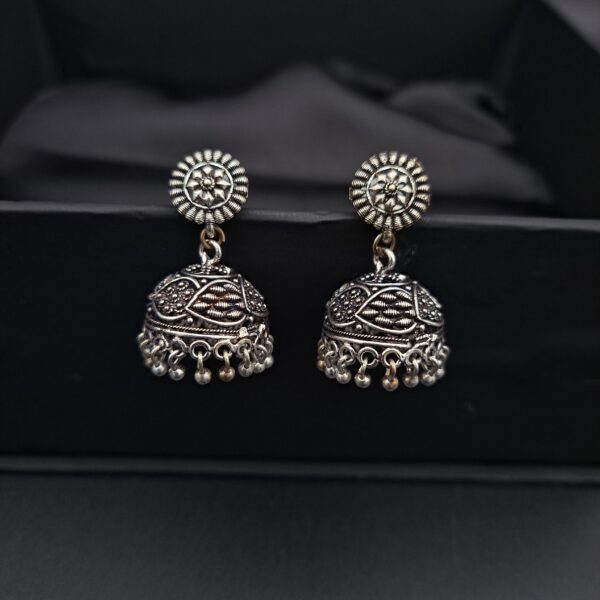 Elevate your everyday look with these detailed, silver-toned drops. The small, swinging bells are heavily textured with traditional motifs, complementing the ornate sunburst stud.