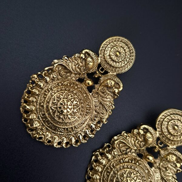 Bold, structured, and richly textured. These antique gold-finished earrings deliver a high-fashion, regal look with their elaborate pattern and generous size