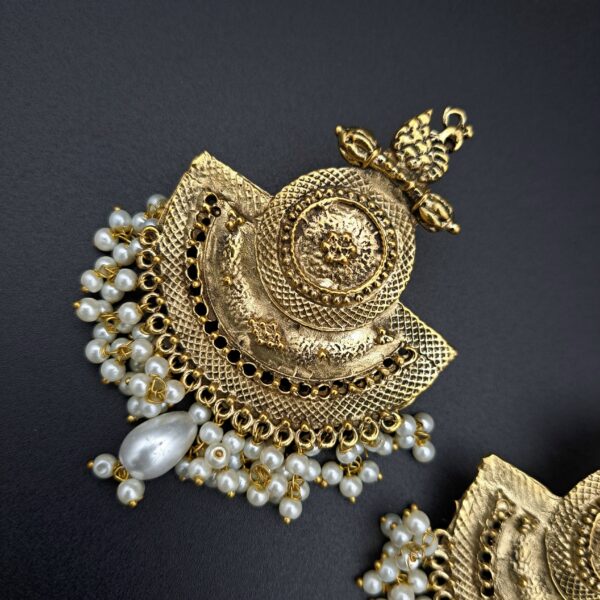 Embrace festive grandeur with these richly detailed earrings. The traditional antique gold finish and layered texture are perfectly complemented by the generous cascade of lustrous white pearls.