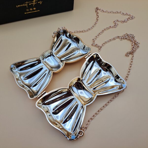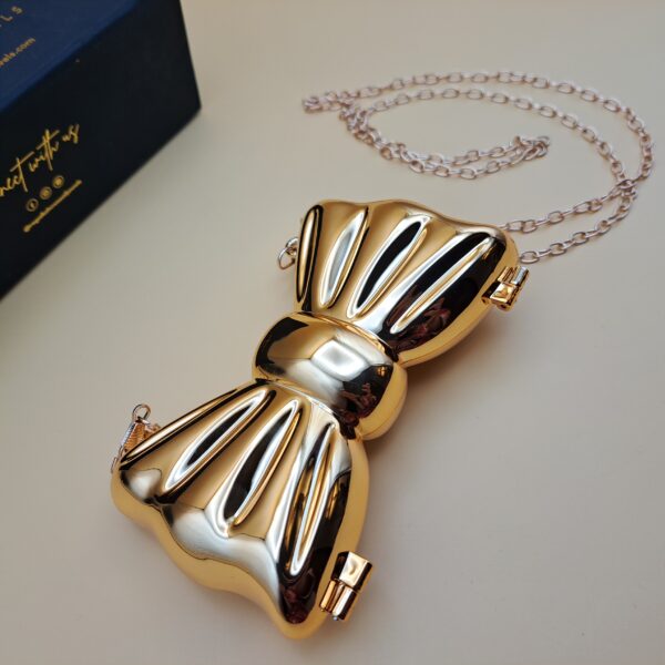 The Bow Statement Clutch with a detachable gold chain. Crafted in high-polish metallic gold, this sculptural bow transforms any outfit. A striking, celebratory accessory that holds your essentials while ensuring all eyes are on you.