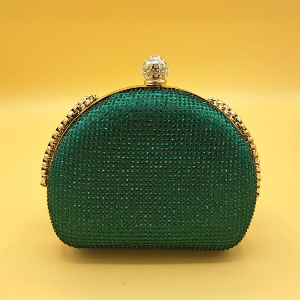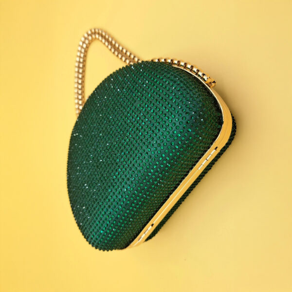 Elevate your evening ensemble with the captivating allure of this emerald green half-moon clutch. The entire body is lavishly adorned with a dense array of shimmering emerald green crystals, creating an intense, continuous sparkle that is utterly captivating.
