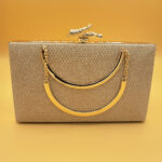 Materials: Hard-shell body, metallic glitter fabric, and gold-toned metal hardware.