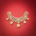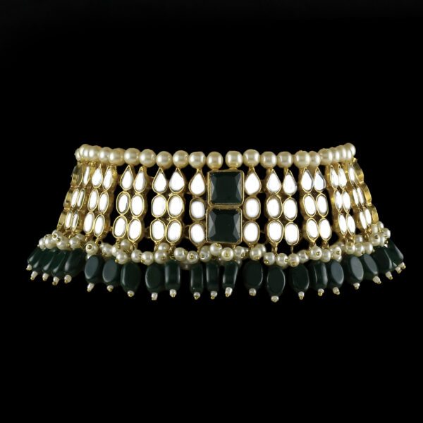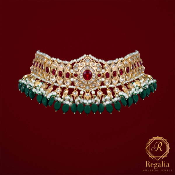 - Gold-plated handworked thappa kundan necklace embedded with real zircon stones and natural pearls embellishments.
