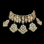 - Gold-plated Sheesha Kundan choker embossed with kundan stones with finishing of emerald and natural pearls.