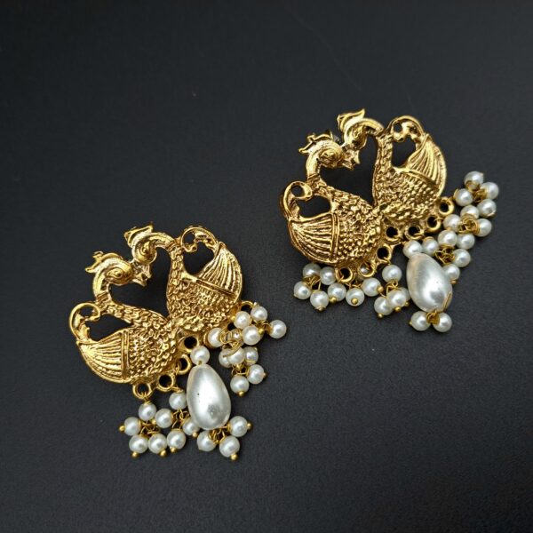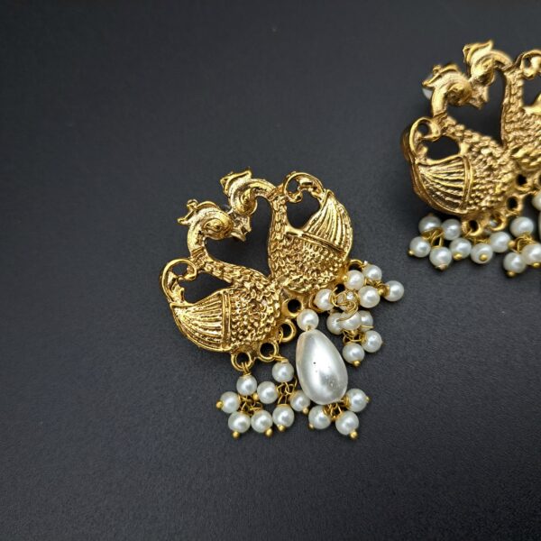 A timeless traditional design featuring two intricately textured gold-plated peacocks. Accented with a cascade of small, classic pearl beads.