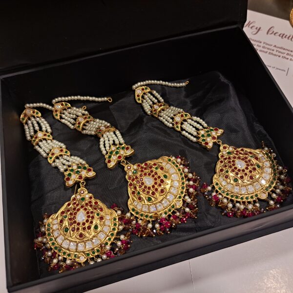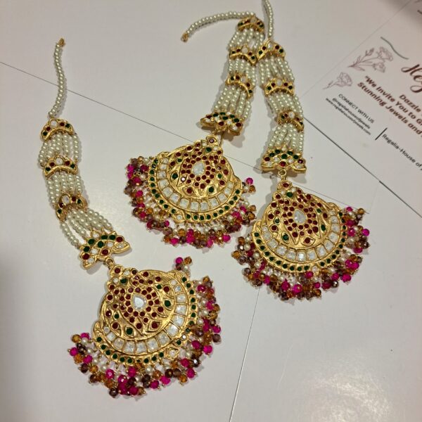 -Gold-plated handworked thappa kundan earrings finely embellished with zircon stones, pink ruby and emerald green stones along with heavy pearls embellishments paired with connected long pearls worked saharas perfect to Add with hairdo.