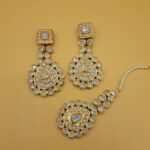 -Gold-plated handworked thappa kundan earrings finely embellished with zircon stones, pink ruby and emerald green stones along with heavy pearls embellishments paired with connected long pearls worked saharas perfect to Add with hairdo.