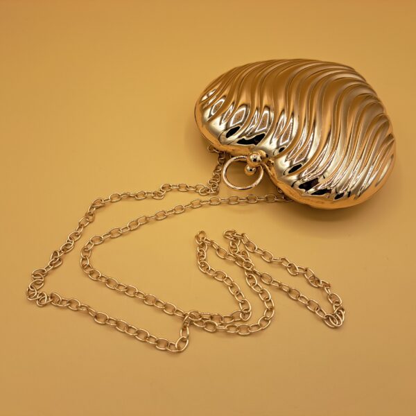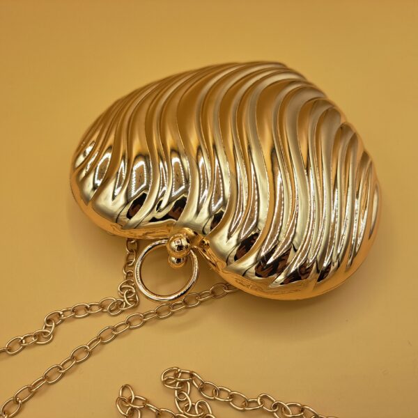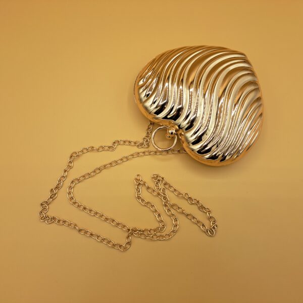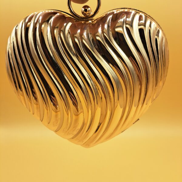 A beautiful gold heart bag with a smooth, wavy pattern on the metal. It comes with a detachable long chain so you can wear it over your shoulder.