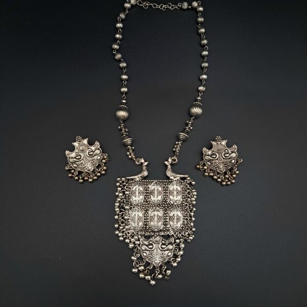 Make a bold statement with this traditional necklace and earring set. The intricate, oversized pendant features classic motifs, including peacocks and detailed panels, all crafted in a beautiful oxidized silver finish.