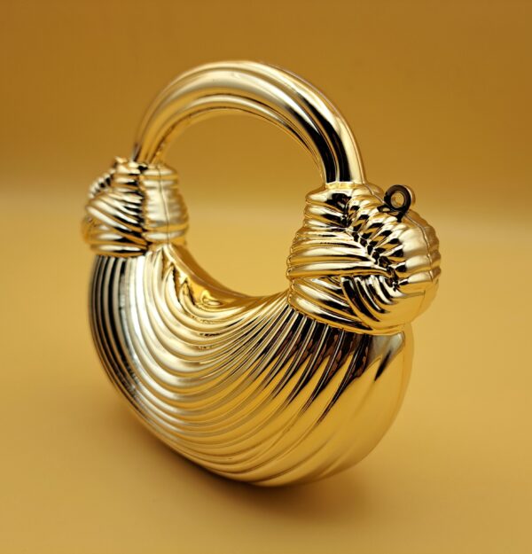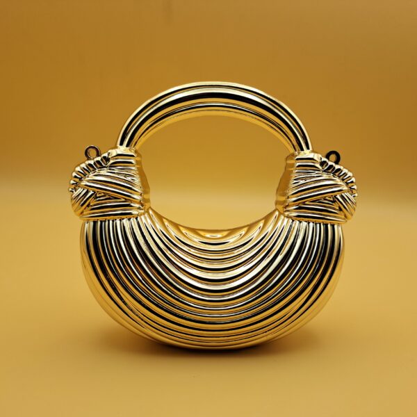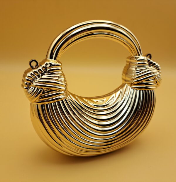 Defined by its structured ring handle and dramatic, engraved lines, this gold metal bag offers a sculptural, modern take on classic glamour. An essential accessory for a high-impact, sophisticated look. It comes with a long gold chain.