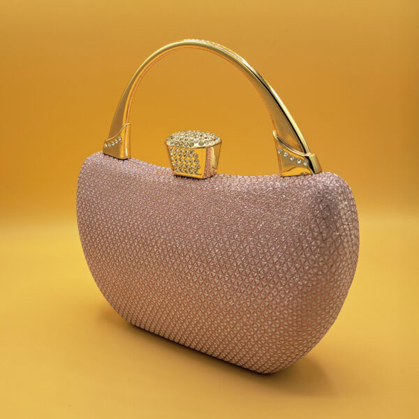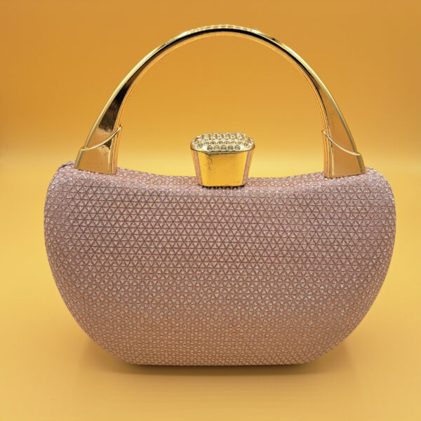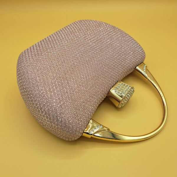 This clutch boasts a chic half-moon or bowed silhouette, crafted from a gorgeous rose gold glitter fabric. The sturdy and stylish handle allows for comfortable carrying as a top-handle bag, adding an extra layer of sophistication.