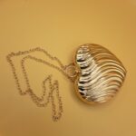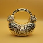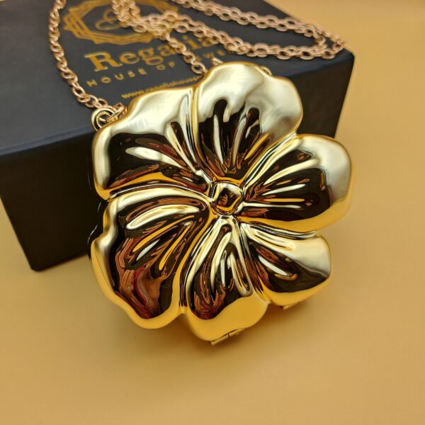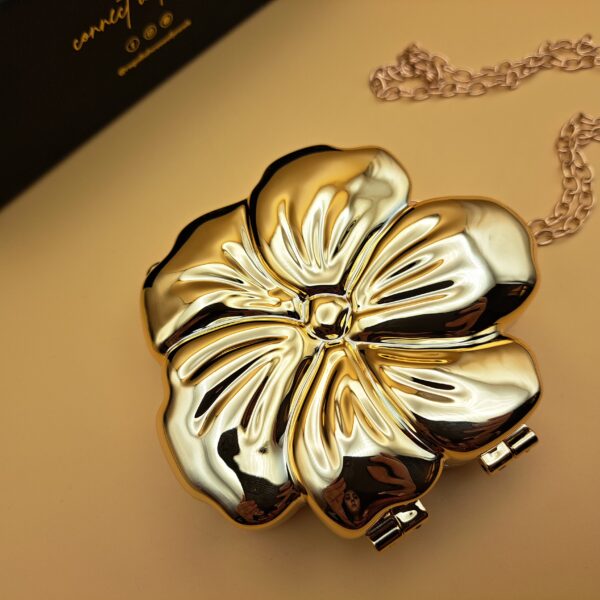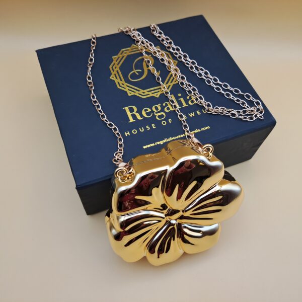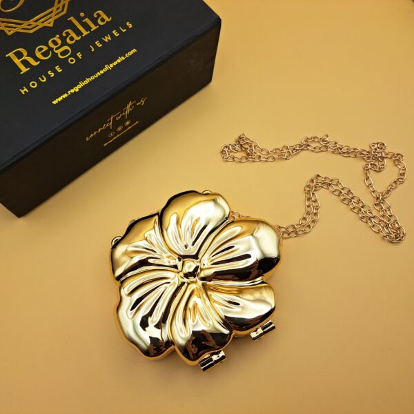 A masterpiece of metalwork, this structural clutch is cast in a high-polish golden finish, meticulously sculpted into a dramatic, full-petaled flower with a detachable gold long chain.It serves as the ultimate statement piece, combining artistry and glamour for festive events.